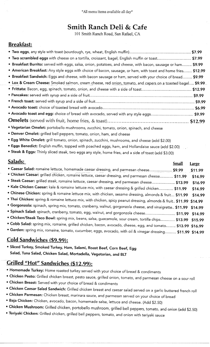 The menu at Smith Ranch Deli and Cafe offers a straightforward and satisfying selection of classic deli fare and comforting drinks, perfect for casual meals throughout the day. Whether you're stopping by for a morning pick-me-up or a relaxed lunch, you’ll find simple dishes designed to complement a welcoming, unpretentious atmosphere.